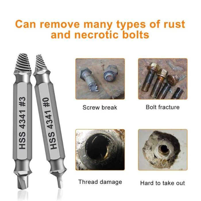 • Just two simple steps to get the job done – drill a hole with a cutting size using the right size screw extractor and easily remove the screw or bolt using the removal tool Hardness 63-65HRC: Titanium hardened steel material, more durable than most screw extractors on the market, better hardness and durability than others, buy with confidence and complete peace of mind.